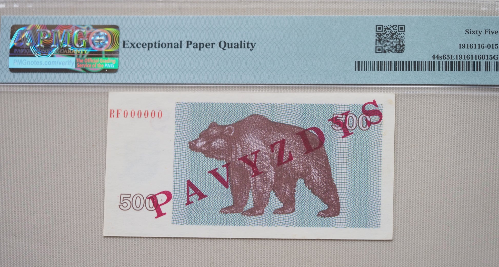Scarce Lithuania 500 Talonas specimen banknote (Pick 44s, 1992) graded PMG 65 Gem Uncirculated EPQ. Bold red PAVYZDYS overprint with zero-serial RF0000000 and “diamond-in-circle” watermark. Front shows ornate 500 value panel; back features the Lithuanian brown bear. High-denomination emergency note issued just before the litas return—perfect for Baltic & world banknote collections. PMG-sealed for guaranteed authenticity; ships protected within 5 business days.