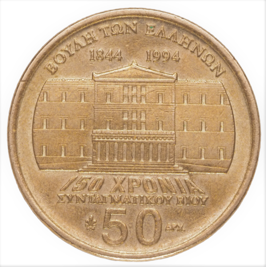 50 Drachma Greece 1844- 1994, 150 years Constitution Coin KM# 164