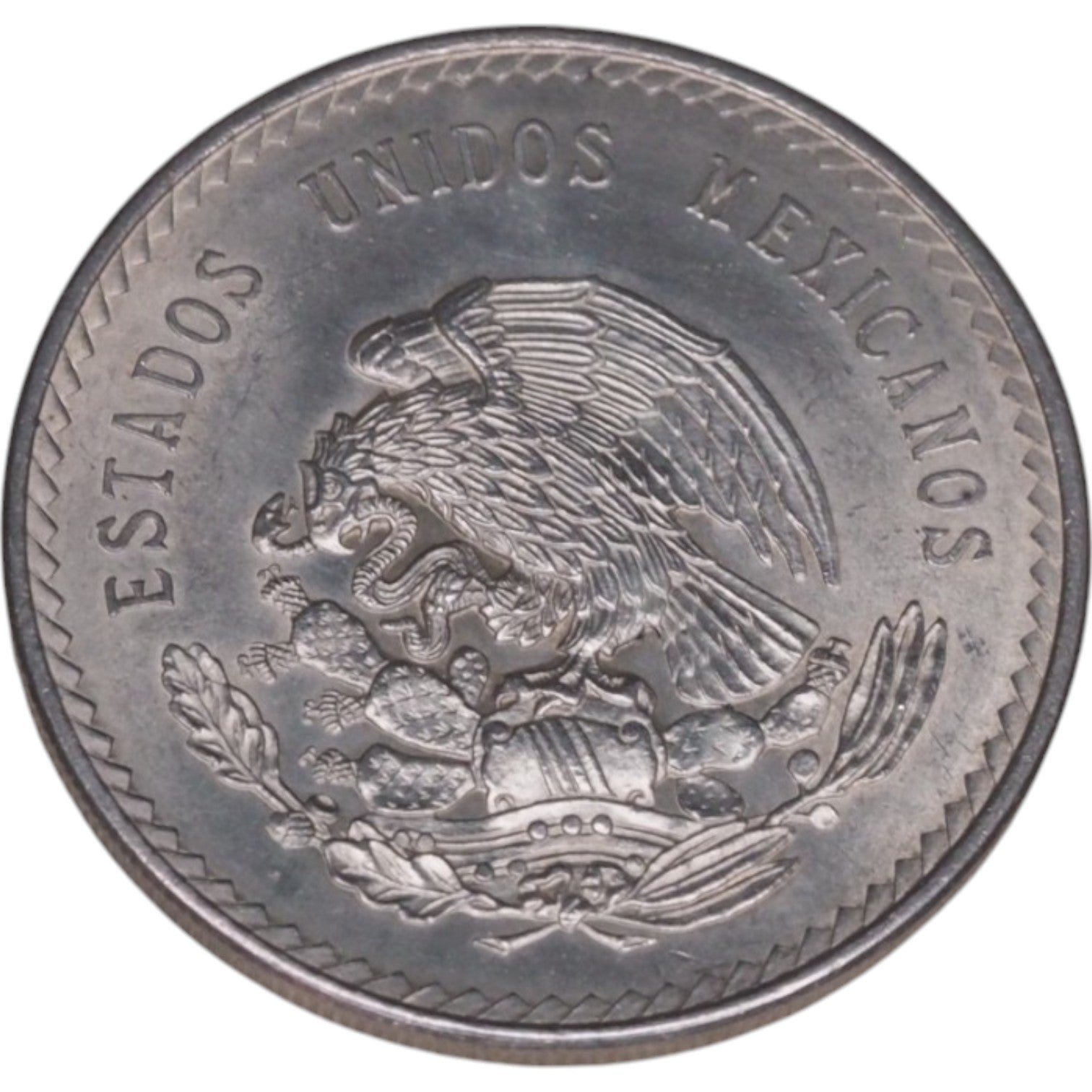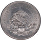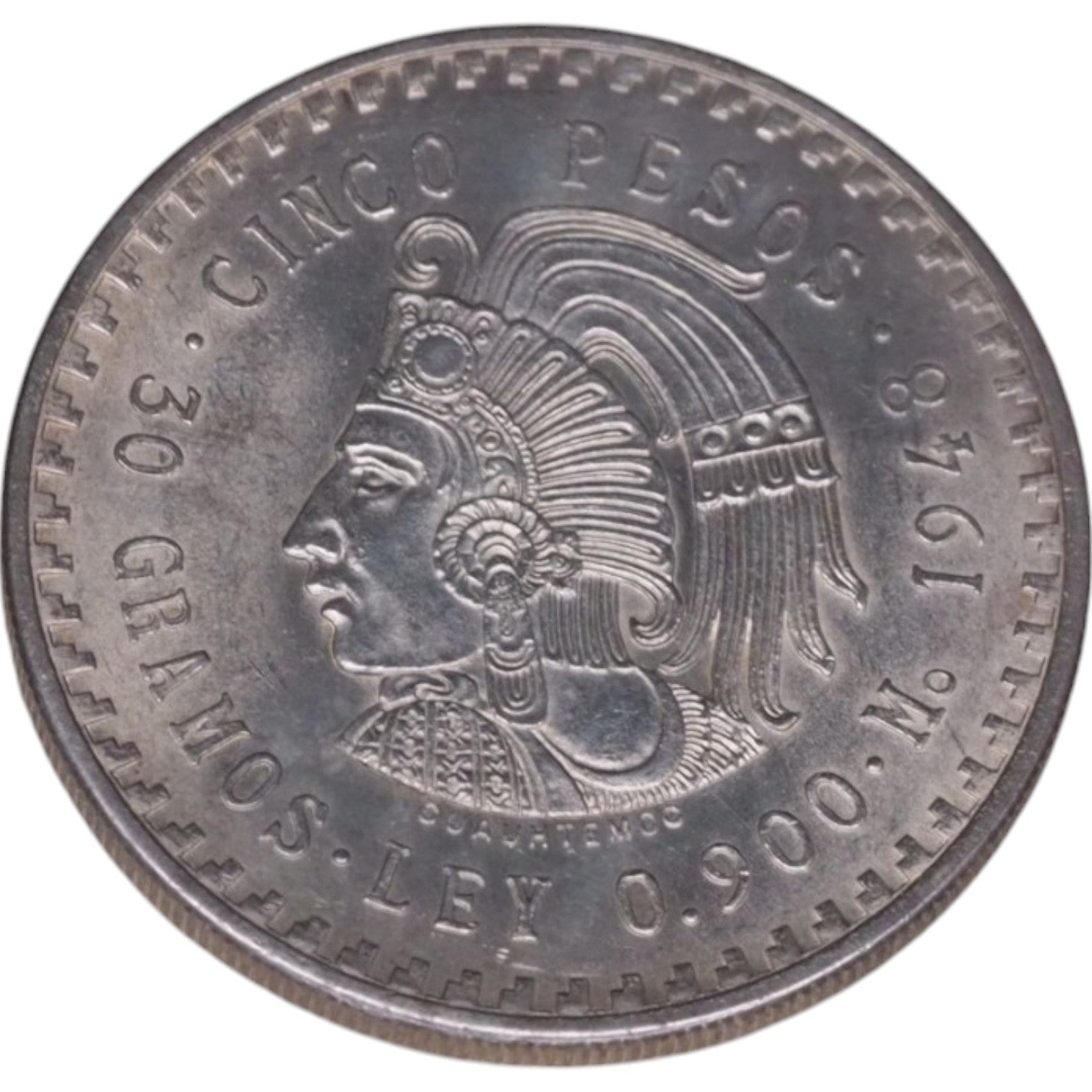 This 1948 Cinco Pesos coin from Mexico features the profile of Aztec ruler Moctezuma II on the obverse. Surrounding the figure are inscriptions "CINCO PESOS," "30 GRAMOS," and "LEY 0.900" (indicating its silver content). The reverse showcases the national emblem of Mexico, with the eagle perched on a cactus holding a serpent in its beak, symbolizing Aztec heritage. The coin is dated 1948, and it is a part of Mexico's silver currency series. This beautiful coin is a fine collectible item, honoring Mexico's rich history and culture.