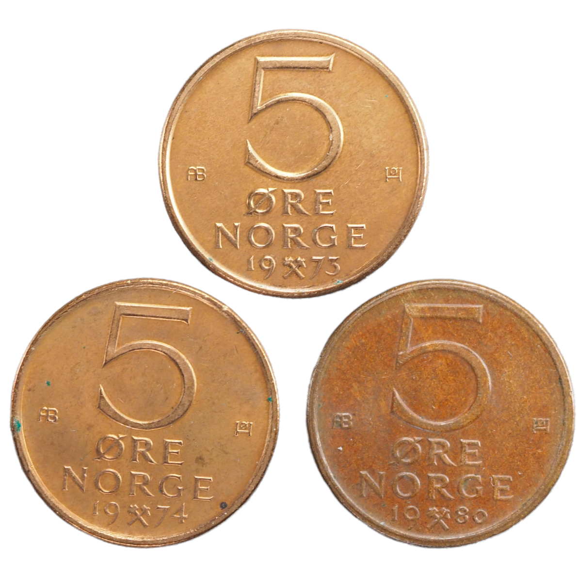 Norway 5 Ore- Olav V Set: 1973; 1974; 1980 Coins KM# 415